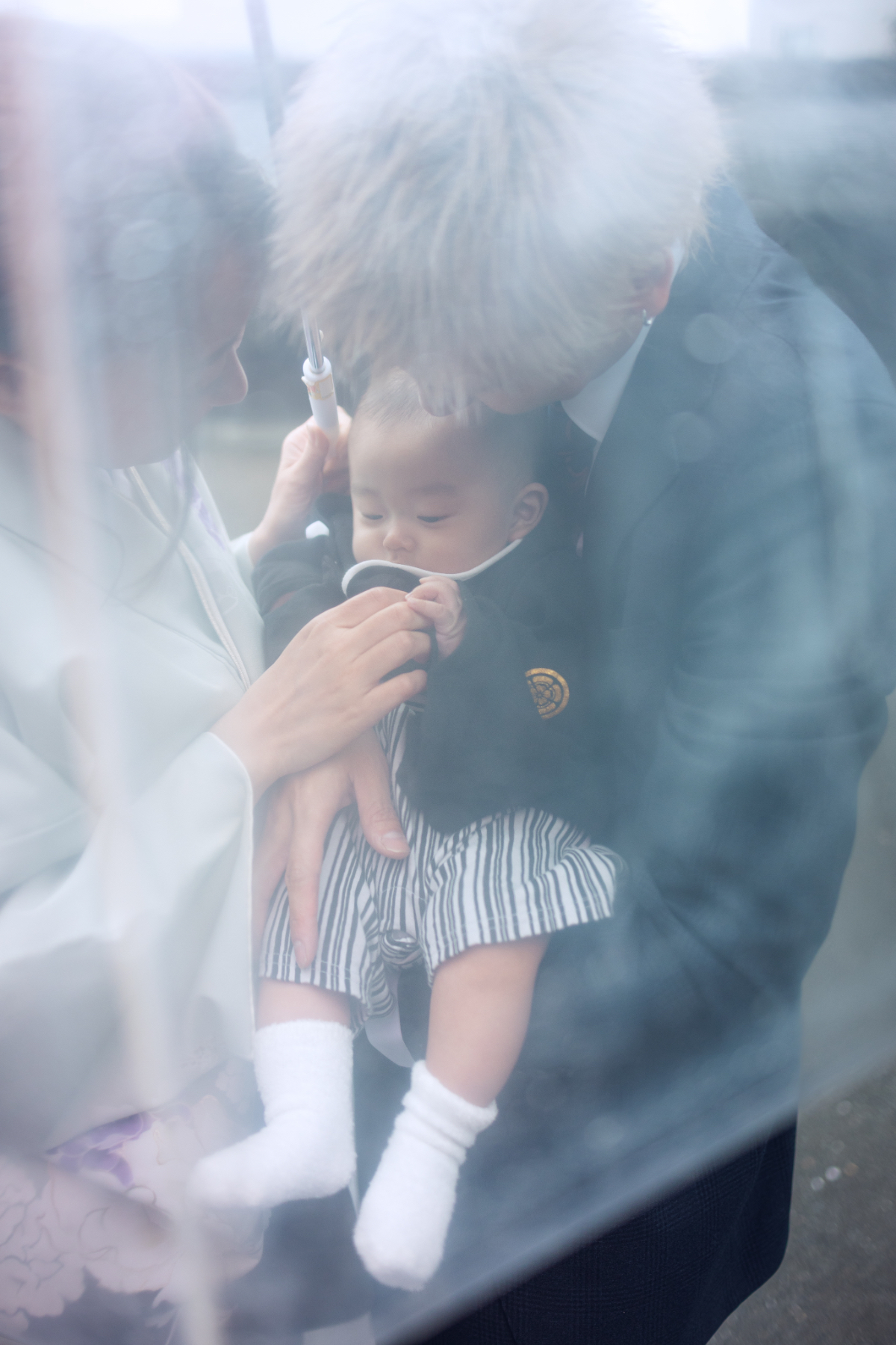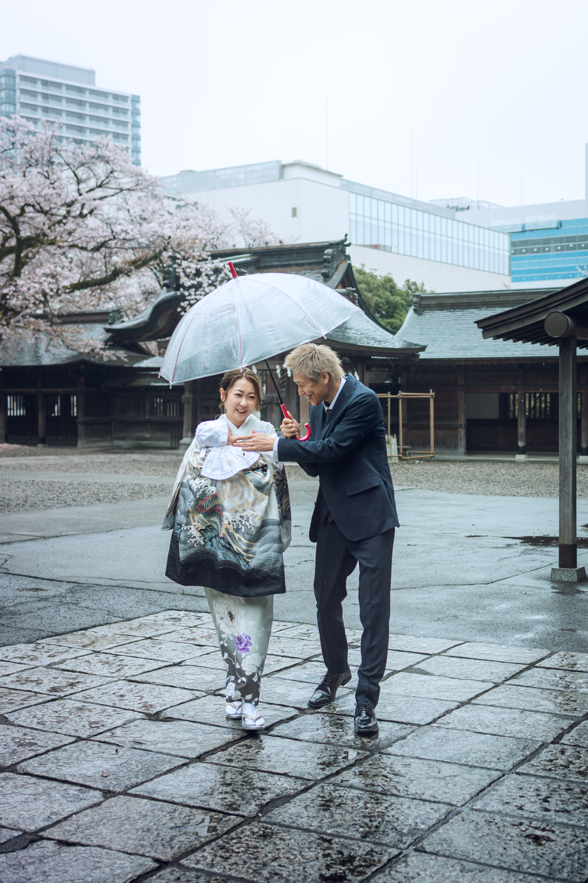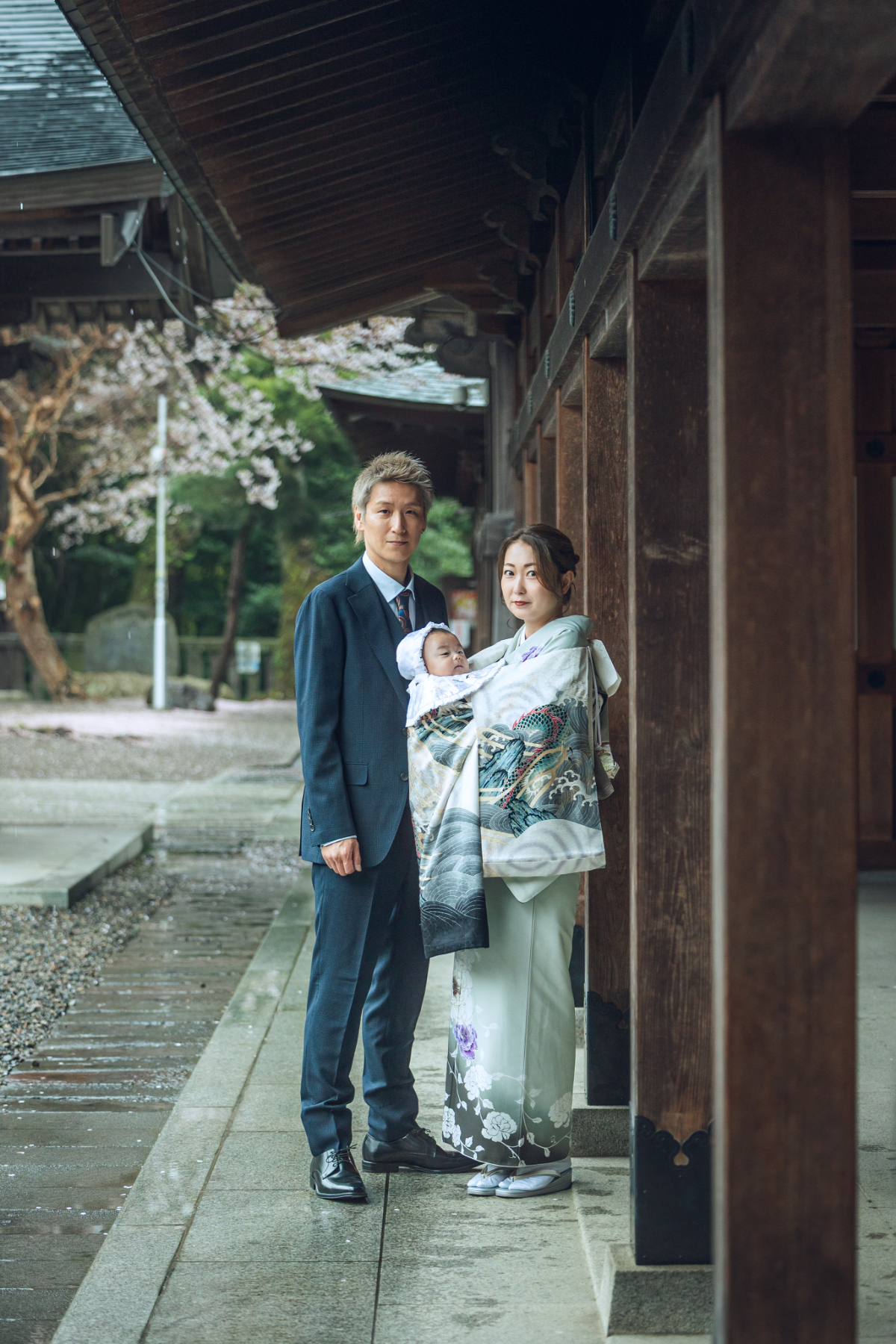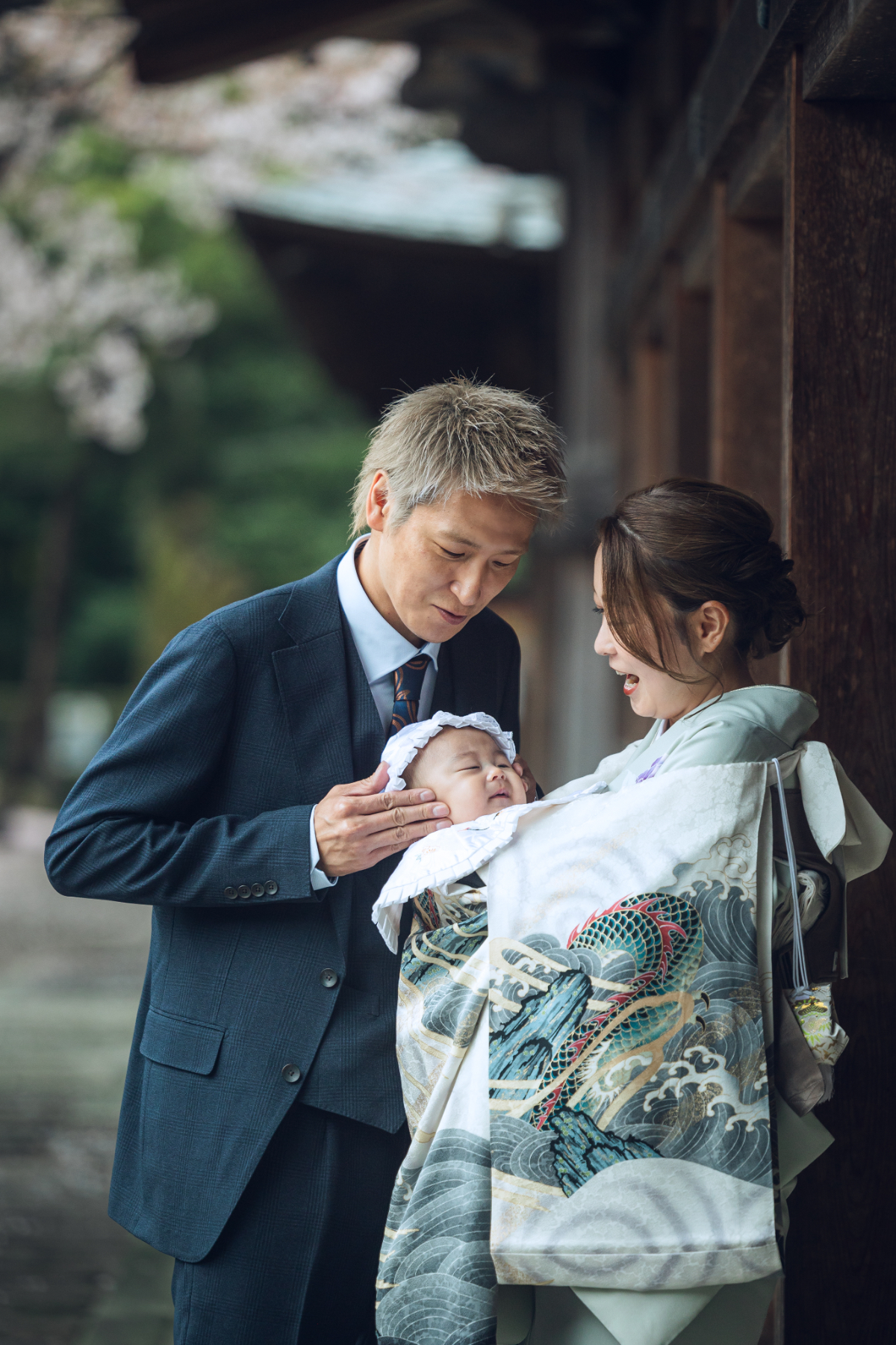 小雨が降る中での、お宮参りの撮影でした。とても優しいご家族様のお陰で温かい時間を過ごさせて頂きました。 ご用意してくださった産着を掛けて、ご祈祷へ。戻られると、スヤスヤと眠っていた僕ちゃん。寝顔も可愛くて、つい撮りたくなっちゃいますね。桜がまだ少し残る季節。途中から雨も上がり、パパの高い高いでニコニコの笑顔も見せてくれて、幸せいっぱいの時間を過ごさせて頂きました。すくすく元気に大きくなぁれ。 minafilm